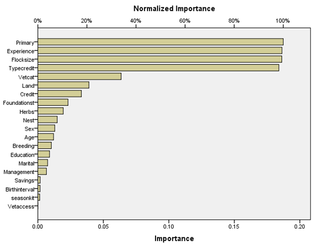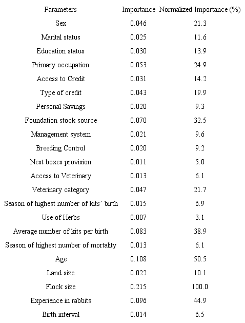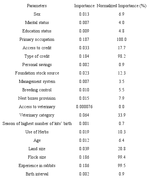 The independent variables importance and their ranking in the estimation of average number of kits per birth using artificial neural network are shown in Table 2 and Figure 1. Primary occupation, experience in rabbit keeping, flock size and credit type were the variables of utmost importance in predicting litter size.