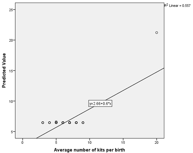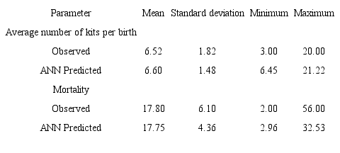 The summary statistics of observed and predicted average number of kits per birth and mortality rate of rabbits are shown in Table 4. The predicted mean value for number of kits per birth using ANN (6.60) was similar to the observed value (6.52). The Standard deviations were 1.48 (ANN) and 1.82 (observed), respectively. With regard to mortality, the predicted mean value using ANN (17.75) was also similar to the observed value of 17.80. Their respective standard deviations were 4.36 and 6.10.