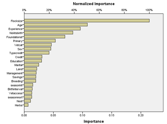 The independent variables importance and their ranking in the estimation of average number of mortality using artificial neural network are shown in Table 3 and Figure 3. Flock size, age of farmers, experience in rabbit keeping and average number of kits per birth were more important in predicting the number of mortality.