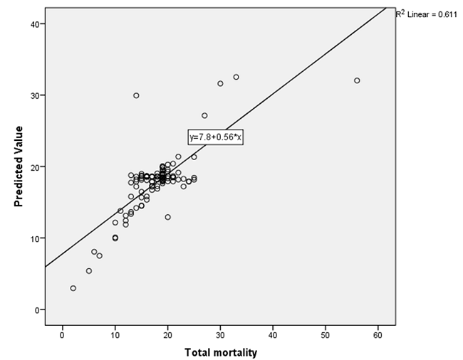 The R2 value obtained in the prediction of mortality using ANN implies that 61.1% of the variation in the number of mortality can be largely explained by the explanatory variables such as flock size, age of farmers, experience in rabbit keeping and average number of kits per birth. The adjusted R2 (60.7%) and low RMSE value of 3.82 conferred reliability on the regression model (Figure 4).