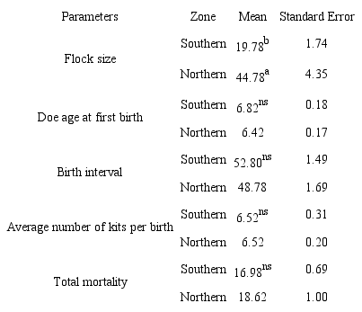Flock size was significantly (p <0.05) higher in the Northern compared to the Southern part of Plateau State. Other variables such as doe age at first birth, birth interval, average number of kits per birth and total mortality were statistically not significant (p >0.05) (Table 1).
