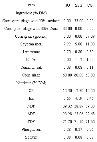 Three Holstein steers weighing on average 477 ± 76 kg, fitted with a rumen and duodenal cannula, were distributed in a 3 x 3 Latin square design. Animals were housed in a roofed masonry facility with 8.8 m² floor space, equipped with a feeder and automatic drinking fountain. The treatments consisted of three concentrate formulations: SO: rehydrated corn grain silage added with 30% okara, SSG: concentrate with rehydrated corn grain silage added with 20% soybean grain and GS: dry corn grain concentrate (control treatment).