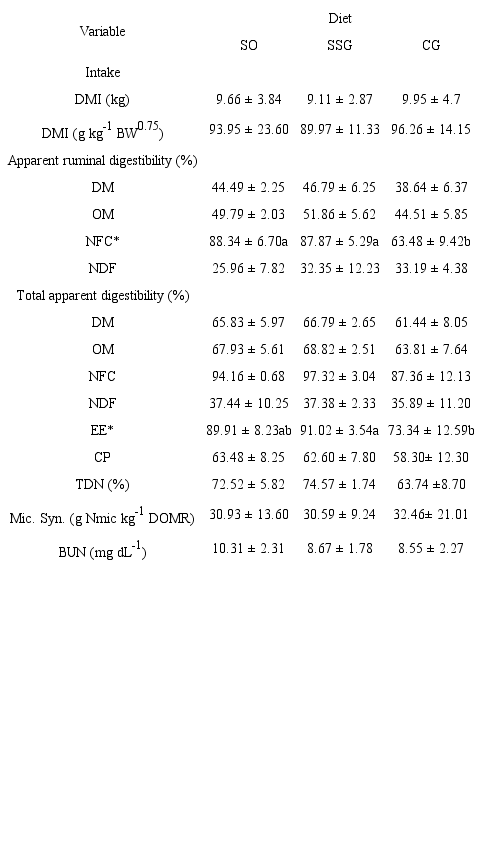 Dry matter intake (DMI), ruminal digestibility and total digestibility of DM, OM, NDF, CP, and TDN were not influenced (p > 0.05) by the intake of SO, GP and CG in the diet. There was no effect (p > 0.05) of treatments on total-tract digestibility. However, the ruminal digestibility of NFC was higher (p < 0.05) with the use of SO (88.34%) and SSG (87.87%) in the diet, compared to the inclusion of GC (63.48%; Table 2). These effects may be related to the fermentation process that takes place during ensiling, since the prolamin protein content is reduced. These proteins, which form the hydrophobic protein matrix around the starch granules, are responsible for limiting the starch degradation by the action of ruminal microorganisms (Hoffman et al., 2011). The decrease in the content of these proteins may occur during the silage fermentation, through solubilization of organic acids such as lactic and acetic acids, as well as by the proteolytic activity of bacterial enzymes or proteases present in the ensiled mass (Kung, Shaver, Grantt, & Schmidt, 2018). Thus, the reduction of these proteins increases starch availability for rumen degradation, which may increase NFC digestibility and DM degradation. Additionally, wet corn grains presented better response in relation to dry grain, which can be attributed to, among other factors, the composition of starch in corn grains (Reis et al., 2001).