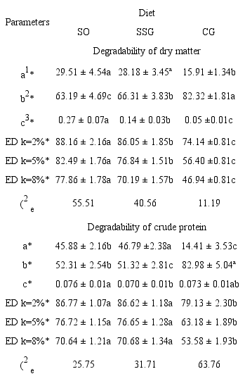 The effect of ensiling on degradation of the protein matrix surrounding starch granules is also evident in the analysis of in situ degradability of CP, since it was observed a similar behavior to the degradation of DM (Table 3). In this way, it was possible to observe an increase (p < 0.05) in degradation of fraction A for the animals that received concentrate with SSG inclusion, followed by the animals that received the concentrate with inclusion of SO and consequent lower degradation of fraction B for these concentrates, when compared to the treatment CG. The potential degradability of CP was also higher (p < 0.05) for SO and SSG. The results for silage degradability were also reported in other studies with grain silages due to the enzymatic hydrolysis of proteins, starch and other carbohydrates that occur due to the fermentation in silos (Silva et al., 2014; Reis et al., 2001).