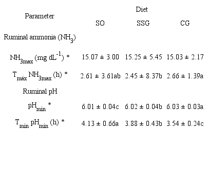 The minimum ruminal pH value had an effect (p <0.05) of the treatments used (Table 4). The ruminal pH values are associated with the concentrations of short chain fatty acids (acetic, propionic and butyric acids) released into the rumen as the main ruminal fermentation products (Vargas Junior et al., 2011). The greater amount of soluble carbohydrates available and the higher digestibility observed in the treatments with inclusion of SO and SSG are associated with higher concentrations of these acids, which when produced at a higher fermentation rate leads to a drop in ruminal pH. According to Hoover and Stockes (1991), moderate reductions in ruminal pH to values up to 6.2 do not cause negative impacts on the ruminal fermentation process or the digestion of fiber carbohydrates.