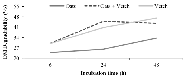 The different forage categories had different CP, NDF, and ADF contents and different forage production (Table 1). Vetch grown alone and oats grown with vetch had higher protein and MM content and less ADF and NDF compared to oats grown alone. The forage production in kg/ha was also higher in the plant species when grown together. Moreover, a significant difference was noted in the rate of degradability measured at 6, 24, and 48 hours. The oats grown alone showed less degradability than the other categories (Figure 1). As for interactions, none was significant and not for any variable evaluated (p = 0.53).