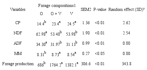 Forage production (kg DM ha-1) was higher when oats were grown with vetch. Overall, grasses are more productive than legumes, but when grasses and legumes are grown together, under low N fertilization condition, forage production increases more than the single species grown alone (Sturludóttir et al., 2013). This results from the higher input of N in the soil (Barel, Kuyper, De Boer, Douma, & Deyn, 2017).