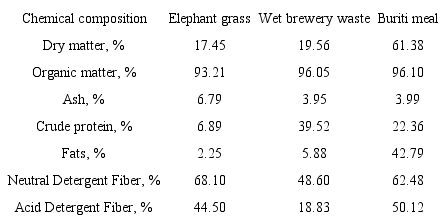Elephant grass (Pennisetum purpureum cv Napier) for silage production was cut at 60 days of age (vegetative stage) at a height of 0.20 cm from the ground. The particle size used was 3 -5 cm aiming to facilitate the compaction of forage in the silo and control the effluent production. The wet brewery waste was obtained from Batuta brewery© (Manaus, AM). The buriti meal was obtained in the Association of Residents of the Santo Antonio do Abonari Community, located at Km 200 of BR-174 highway.