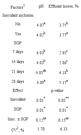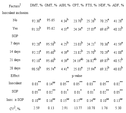 On the other hand, the use of inoculant during silage production provided lower (p < 0.05) contents of dry matter and fiber (neutral and acid detergent) (Table 3). It is important to mention that losses of dry matter occur due to the respiration of microorganisms that convert soluble carbohydrates and organic acids into heat, water, and CO2 (Schmidt et al., 2011).