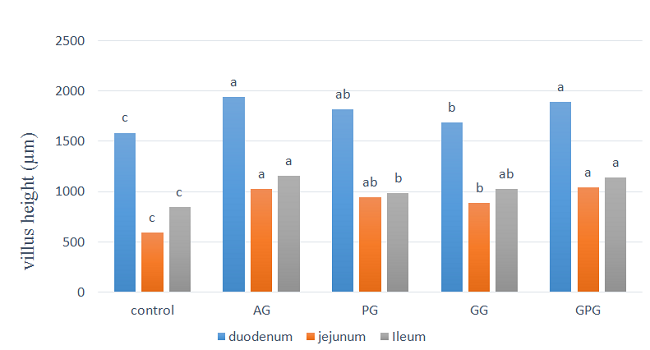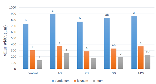 Figure 1 shows the villi height differences between the different parts of the small intestine. According to observations in duodenum and jejunum, the chicks that used antibiotic and garlic powder with probiotic in their diet had the highest height of villi in their intestinal duodenum part; and they show no significant difference with each other (p < 0.05). Also, as it can be seen, the height of the small intestinal villi in groups using probiotic and garlic powder were significantly higher than the control group (p < 0.05). In ileum part, the observed statistical differences were similar of duodenum and jejunum except there were no statistically significant differences between the groups using diets include antibiotics, probiotic and probiotic with garlic powder with each other (p > 0.05). The Figure 2 shows the villi width differences between the different sections of small intestine. Based on this Figure, in the intestinal segments of duodenum and jejunum, the chicks have used antibiotic, garlic powder and garlic powder plus probiotic have the maximum width of villi; and AG and GPG have significant statistical differences with the control and probiotic groups (p <0.05). The results of the villi width in ileum part indicate that, like the duodenum and jejunum, antibiotics and garlic powder plus probiotic show the most intestinal widths of villi in this part; But unlike those two previous parts (duodenum and jejunum), these two treatments have significantly increased wider villi than those have used only probiotic in their diet (p <0.05); However, all treatments have a larger width than the control group (p < 0.05).