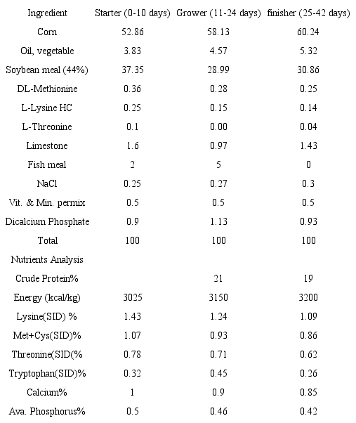Body performance of each replicate including feed intake (FI), body weight gain (BWG) and feed conversion ratio (FCR) was calculated at the end of days 10, 24 and 42.
