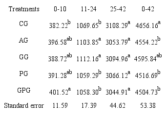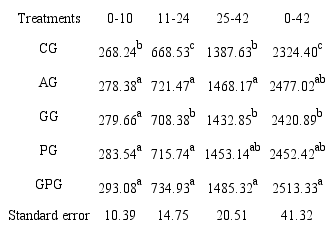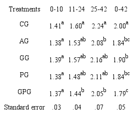 In the second stage of the rearing period (11 to 24 days), respectively the highest and lowest feed intake were observed in GG and GPG. AG and GG showed statistically higher feed intake than other experimental groups (p < 0.05). The use of antibiotic in this stage significantly increased feed intake in AG than CG, PG and GPG (p < 0.05). There were no significant differences in feed intake between the averages obtained from different groups in the last stage of the experiment (25 to 42 days) (p > 0.05). Between the days 0 to 42 the highest feed intake showed in control group which created significant differences with PG and GPG (p < 0.05) exception GG (p > 0.05). There were no significant differences between all other experimental groups (p > 0.05).