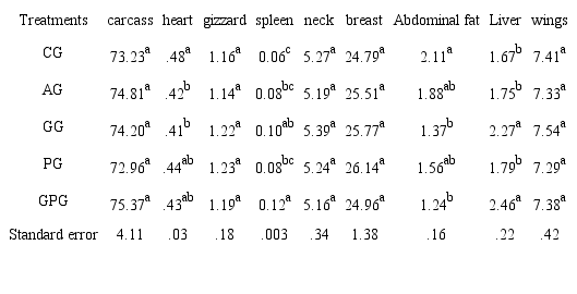 There were no significant differences between the average weights of the organs of breast, gizzard, neck, carcass, wings and thigh (p > 0.05), but the average weights of heart, spleen, liver and abdominal fat showed several significant differences (p < 0.05).