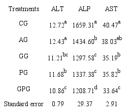 Liver enzymes appeared in serum at day 42 of age are presented in Table 6. According of this table the use of garlic powder and probiotic significantly has decreased the activity of all three liver enzymes including AST, ALT and ALP (p < 0.05). Also the use of probiotic has decreased enzyme activities of AST and ALT (p < 0.05).