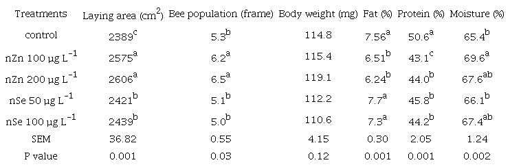 The effects of nano-selenium and nano-zinc oxid supplementation on egg laying area, bee population and body composition were presented in Table 1. There was significant difference for egg laying area in colonies received nano-zinc at the two levels compared to the other treatments and the control group. The positive effect of nano-zinc on laying area and worker population may be related to overcome the thermal stress and defense against free radicals. Based on the study of Sahu et al. (2015), zinc plays a vital role in the synthesis of proteins, lipids and carbohydrates and also reduces the duration of larval and pupal stages. In addition zinc is needed as a cofactor for activity and structure stability of antioxidant enzymes. The antioxidant enzymes of insects are generally composed of catalase and Zinc is function as cofactor for antioxidant enzymes (Tasaki, Kobayashi, Matsuura, & Iuchi, 2017). Mariani et al. (2008) reported that the potential beneficial effects of Zn supplementation on Zn-dependent antioxidant enzymes. Sahu et al. (2015) reported that foliar supplementations of Zinc increased the activity of catalase and Glutathione S-transferase significantly in the whole body homogenate of insects. Also, Zhang et al. (2015) reported that Zinc nutrition increases the antioxidant defenses of honey bees.