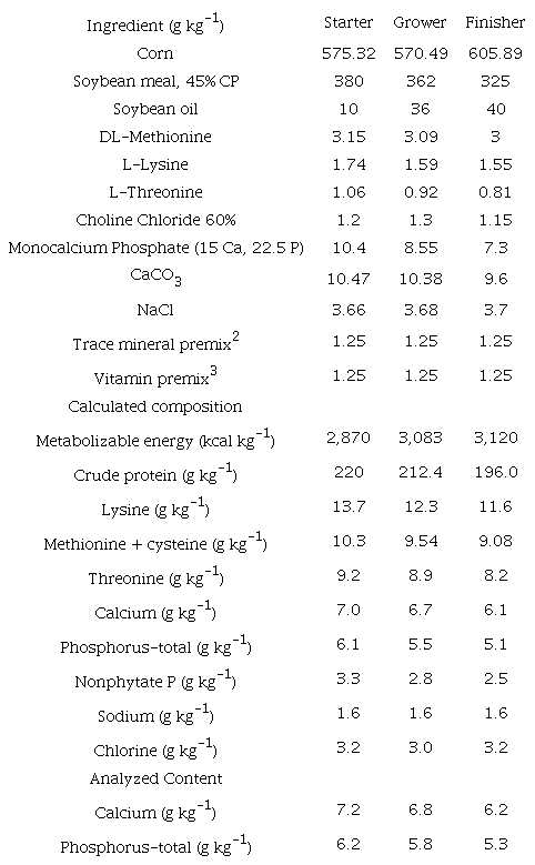 The dietary treatments were formulated after analyzing of feed ingredient (monocalcium phosphate, CaCO3, Soybean meal, and corn), for Ca and tP contents according to standard Association Official Analytical Chemist (AOAC, 1995) procedures. Dietary Ca and tP concentration were determined by the ICPOES method 2011.14 (AOAC, 1990).