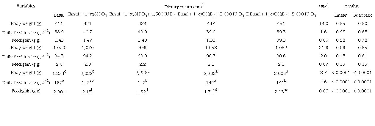 Performance data of broilers throughout the entire experimental period are presented in Table 3. At 42 d of age, broilers fed 1-α(OH)D3 in combination with 1,500 (2,223 g) or 3,000 (2,202) IU cholecalciferol kg-1 of diet had significantly higher BW compared with broilers fed basal diet (1,874 g), 1-α(OH)D3 alone (2,029 g), and 1-α(OH)D3 in combination with 5,000 (2,006 g) IU cholecalciferol kg-1 of diet. Throughout the entire experimental period broiler chickens fed basal diet had the highest DFI and the lowest final BW. Broiler chickens fed diet supplemented with 1-α(OH)D3 in combination with different levels of cholecalciferol had significantly lower DFI than those fed basal diet or basal diet supplemented with 1-α(OH)D3 alone. Broiler chickens fed basal diet supplemented with 1-α(OH)D3 in combination with 1,500 (1.73) and 3,000 (1.74) IU cholecalciferol kg-1 of diet had better FCR values compared with broilers fed basal diet (2.26), basal diet supplemented with 1-α(OH)D3 alone (1.96), and basal diet supplemented with 1-α(OH)D3 in combination with 5,000 (1.91) IU cholecalciferol kg-1 of diet (p < 0.01).
