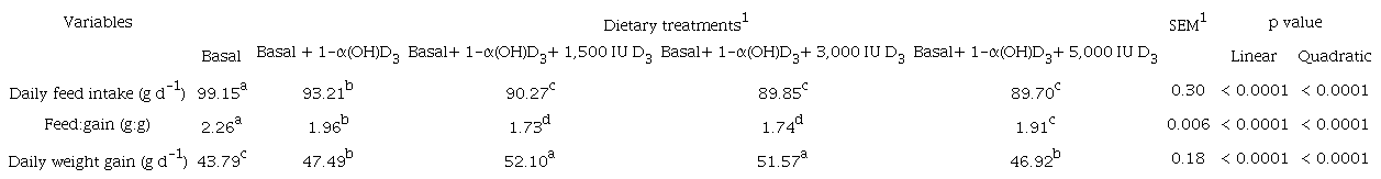 where μ is the overall mean, Ti is the effect of experimental treatments and eij is the random residual error. Orthogonal comparisons were performed to determine the linear and quadratic effects of the cholecalciferol levels or 1-α(OH)D3 on growth performance and tibia quality of broilers. Means were compared using the Tukey’s test at 5% significance.