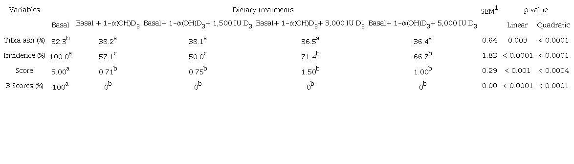 Tibia related parameters of broilers are presented in Table 4. Dietary supplementation of 1-α(OH)D3 alone or in combination with different levels of cholecalciferol linearly and quadratically (p < 0.01) affected tibia bone ash, incidence and severity of TD. Broilers fed TD inducing diet had lower tibia bone ash (32.3%) compared with those fed TD inducing diet supplemented with 1-α(OH)D3 alone (38.2%), or with combination of 1,500 (38.1%), 3,000 (36.5%) and 5,000 (36.4%) IU cholecalciferol kg-1 of diet. Supplementation of the diet with 1-α(OH)D3 alone (57.1%) or with combination of 1,500 (50.0%), 3,000 (71.4%) and 5,000 (66.7%) IU cholecalciferol kg-1 of diet significantly lowered the incidence of TD compared with those fed TD inducing diet (100%). Supplementation of 3,000 (71.4%) or 5,000 (66.7%) IU cholecalciferol kg-1 of diet significantly increased the incidence of TD compared with those fed basal diet supplemented with 1,500 (50.0%) IU cholecalciferol kg-1 of diet. Supplementation of the diet with 1-α(OH)D3 alone or in combination with different levels of cholecalciferol lowered the percent of 3-scored birds. The addition of 1-α(OH)D3 alone (0.71) or in combination with 1,500 (0.75), 3,000 (1.43), and 5,000 (1.00) IU cholecalciferol kg-1 of diet significantly lowered the TD score than those fed basal diet (3.00).
