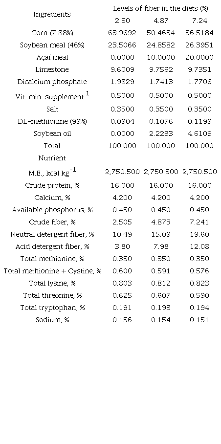 Açaí meal was used as a source of fiber in the diets. The açaí residues (constituted by seed and peel) of Euterpe precatoria Mart specie were obtained at one time. The residues were selected, washed, dried in an oven at 60°C for 24 hours and grinding. The composition of açaí meal (Table 1) was determined according to the methodology proposed by Association of Official Analytical Chemists [AOAC] (2016). The three experimental diets (Table 2) were formulated to meet or exceed Rostagno et al. (2017) nutrient requirements for laying hens.