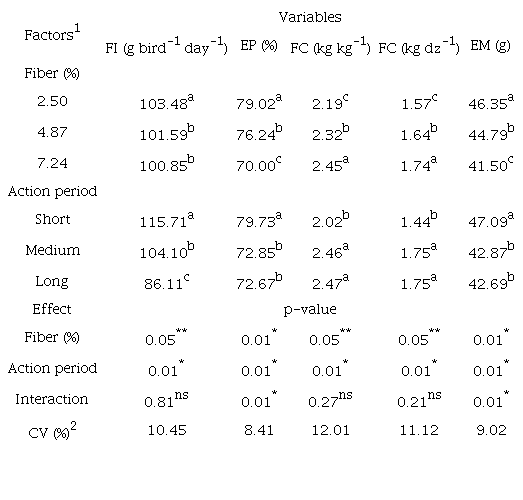 All performance results were affected (p < 0.05) by fiber and its action period (Table 3). Moderate levels of fiber provide better performance results, while high levels of fiber caused a significant reduction in performance, as well as prolonged exposure of birds to diets with fiber for long-term. There was a significant effect (p < 0.05) in interaction of the factors in results of egg production (Table 4) and egg mass (Table 5), where high levels of fiber and a prolonged exposure of birds to diets with high levels of fiber for a long-term caused a significant reduction in egg production and egg mass.