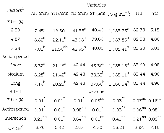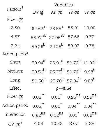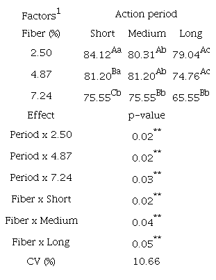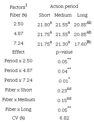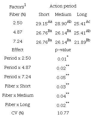 Birds fed diets with low and moderate levels of fiber produced eggs with higher (p < 0.05) weight and percentage of albumen. The increase in action period of fiber caused a significant reduction (p < 0.05) in egg weight and percentage of its main structures (yolk, albumen and eggshell) (Table 6). There was a significant effect (p < 0.05) in interaction of the factors on results of %yolk (Table 7), where increase levels of fiber caused a linear reduction in %yolk in all periods evaluated.
