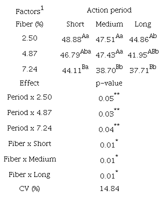 The experimental design was factorial scheme considering three levels of fiber (2.50, 4.87 and 7.24%) in birds’ diets, and three action periods of this fiber (short - 21 days, medium - 56 days, and long - 105 days) in the feed. For animal performance, were evaluated in each period the feed intake (g bird-1 day-1), egg production (%), egg weight (g), egg mass (g), feed efficiency (kg of feed per dozen of eggs produced-kg dz-1) and feed conversion (kg of feed per kg of egg produced-kg kg-1).