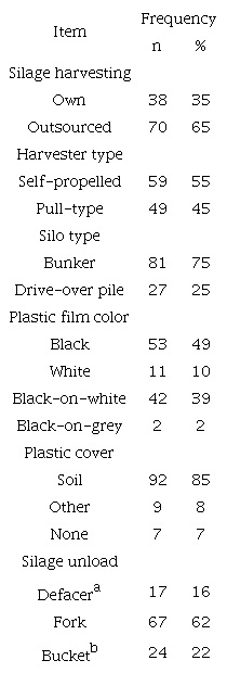 Few studies on silage losses have been carried out under field conditions. Additionally, the literature on silage management practices in Brazilian farms is scarce (Bernardes & Do Rêgo, 2014). Therefore, the aim of this study was to correlate the occurrence of visible silage losses (effluent, spoiled top-layer and during feedout) with silage making-practices, physical and chemical characteristics of silage, and milk composition in Brazilian farms.