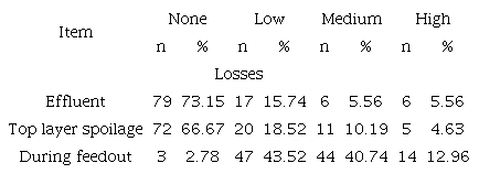 Data about feedout losses are from silage wastage and refusals by cattle. In addition, there are losses occurring in the silo during the feedout process. This is due to oxygen penetrating the silo face. This oxygen is used by aerobic spoilage microorganisms, reducing the carbohydrate content of the silage. In this way, the high frequency of feedout losses in the evaluated farms is the opposite of that verified in 88% Brazilian farms that provide spoiled silage for the animals. It may compromise animal health and milk production (Bernardes & Do Rêgo, 2014).