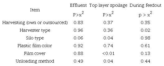 Data about presence of top layer spoilage (Table 2) may be considered high. The type of service had no influence on the visible losses (p > 0.05; Table 3). Around 75% silage produced was stored in bunker silos and 85% farmers used soil to cover the plastic film (Table 1), which reduced the occurrence of top spoilage (Table 2). The color of plastic film did not influence the visible losses in silages (Table 1 and Table 3).