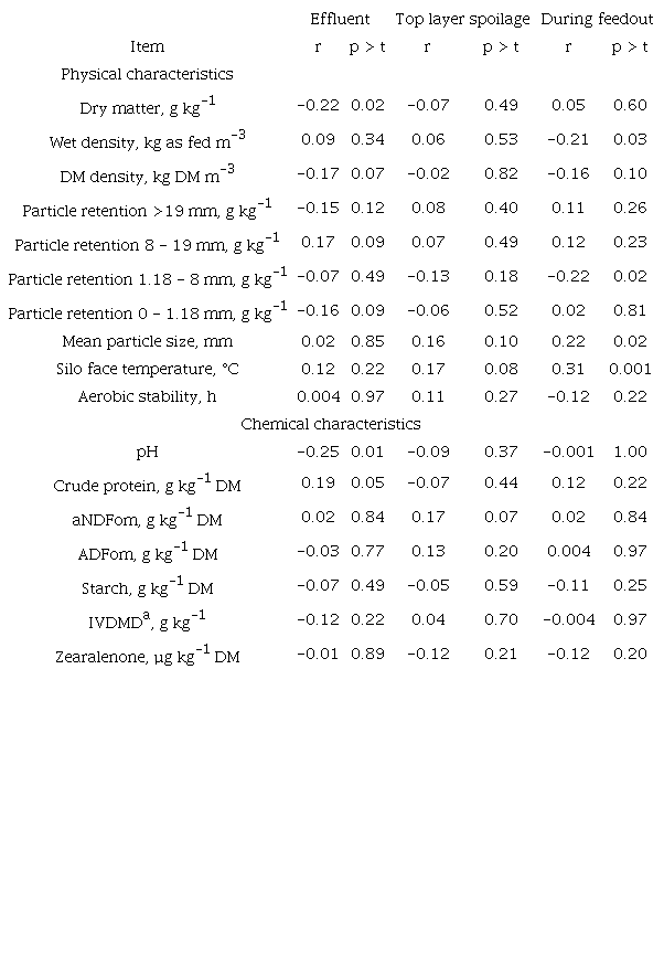 ABSTRACT: The aim of this study was to relate the occurrence of visible losses in silage (effluent, spoiled top-layer and during feedout) with silage-making practices, physical and chemical characteristics of silage, and milk composition in Brazilian dairy herds. One-hundred and eight silos from 95 farms, in the State of Parana, were visited for data collection. Data were analyzed by Fisher's Exact and Pearson Correlation Test. Effluent loss was higher in silages with the lowest dry matter content. Using unwalled clamp (drive-over piles) silos, neglecting a protection over the plastic film, and unloading silage with a bucket increased the occurrence of top spoilage. Feedout losses were higher in farms where: the crop was harvested with self-propelled machines; the particle size was larger, and the silage density was lower. There was no relationship between visible losses and silage composition or milk composition, except for milk fat content that, unexpectedly, there was a positive correlation with spoiled silage in the top-layer. Silage losses are reduced by adopting good practices during silage production and feedout.