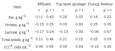 The milk fat content was the only variable (among milk composition) significantly correlated with silage losses, being higher in silages with the highest top spoilage losses (p < 0.05). Furthermore, milk protein and total solids showed a trend toward correlation with feedout losses (p < 0.10; Table 5).