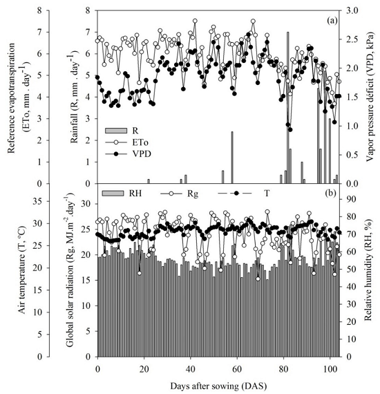 To calculate ETo, the Penman-Monteith method standardized by FAO Bulletin 56 (Abreu, Silva, Teodoro, Holanda, & Sampaio Neto, 2013) was used, using meteorological data (Figure 1) obtained through a Meteorological Station Automatic, belonging to the National Meteorological Institute (INMET, www.inmet.gov.br), located 290 m from the experimental area.