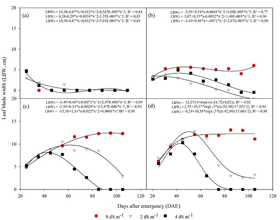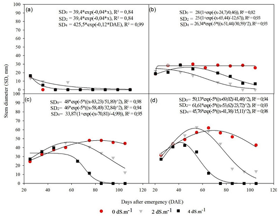 In the treatments that received 2.0 dS m-1 salinity water, the increase in stem diameter only occurred until 55 DAE in the two largest blades, with values close to the treatments without salt, with no statistical difference between treatments (p < 0.05) (Figures 2c and 2d).