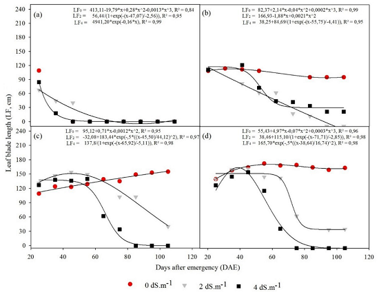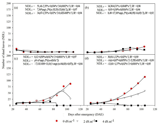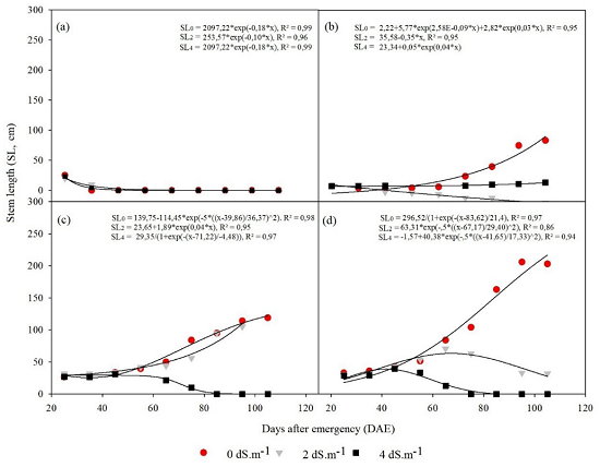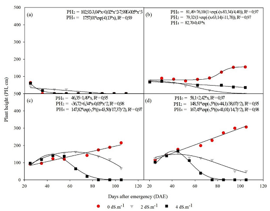 Under salinity of 2.0 dS m-1, applying a blade of 75%.ETc the plants grew up to 65 DAE, reducing their height thereafter. Whereas in the 100%.ETc slide, growth only occurred until approximately 42 DAE (Figure 4c and 4d).