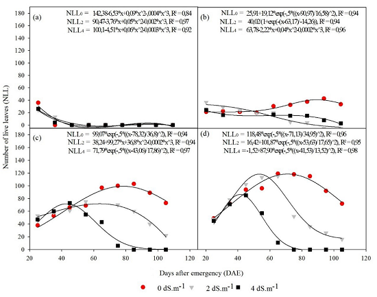 The number of dead leaves increased over time on the three blades (50%.ETc, 75%.ETc and 100%.ETc) with zero salinity and was greater with the increase in available water (Figure 6). The increase in the number of dead leaves depending on availability and over time is explained by the plant senescence. However, under the condition of 50%.ETc and 2.0 dS m-1, the number of dead leaves remains constant until 85 DAE, when plant death occurred in this treatment. This stability can be a defense mechanism for millet against salt stress. Under this same salinity, but with a blade of 75%.ETc the number of dead leaves remained constant until 85 DAE with a slight increase thereafter, period in which the number of live leaves started to decrease. In 75%.ETc, 100%.ETc and 4.0 dS m-1 there was no increase in the number of dead leaves.