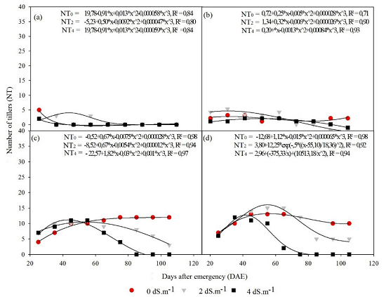 The number of millet tillers showed the same behavior as the other variables in the availability of 25%.ETc (Figure 9a). In treatments with slides of 50%.ETc, the levels of salinity caused a reduction in the number of tillers (Figure 9b). In the treatment with a 75%.ETc blade and zero salt (Figure 9c), an exponential behavior is observed as a function of time, with an increase in the number of tillers up to 75 DAE, remaining constant thereafter. However, with 75%.ETc and 2.0 dS m-1 of salinity, the increase in the number of tillers only occurs until 55 DAE, the same occurred in the salt level of 4.0 dS m-1, only this reduction started a little earlier.