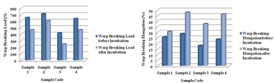 From the statistical analysis done for manufactured samples, it was shown from Figure 1 that warp breaking load before incubation has the highest values compared with the warp breaking load after incubation, this is interpreted due to exposure the samples to conditions that weakens its strength (oven and incubation). Sample 2 recorded the highest warp breaking load, while sample 3 recorded the lowest breaking load before and after incubation, this is mainly due to increasing the number of filaments per yarn for sample 2 which equals 144 and decreasing it for sample 3 which equals to 96. Warp breaking load was significantly affected by denier per filament, weft density and incubation (p ˂ 0.001) with no significant interaction, while warp breaking elongation was not significantly affected by denier per filament (p ˂ 0.362) and was significantly affected by weft density and incubation (p ˂ 0.002, p ˂ 0.001 respectively) with no significant interaction.