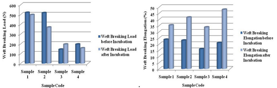 It was shown in from Figure 2 that weft breaking load before incubation has the highest values compared with the weft breaking load after incubation. This is interpreted due to exposure the samples to conditions that weakens its strength (oven and incubation). Sample 1 recorded the highest warp breaking load, while sample 3 recorded the lowest breaking load before and after incubation, this is mainly due to increasing the number of filament per yarn for sample 1 which equals 144 and decreasing it for sample 3 which equals to 96. For Weft breaking load was significantly affected by denier per filament, weft density and incubation (p ˂ 0.001, p = 0.010 and p ˂ 0.004 respectively) with no significant interaction, while weft tensile elongation was not significantly affected by denier per filament (p ˂ 0.600) and was significantly affected by weft density and incubation (p ˂ 0.026, p ˂ 0.001 respectively) with no significant interaction.