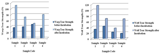 For weft tear strength before incubation sample 2 recorded the highest value while sample 4 recorded the lowest value. For both warp tear strength after incubation and weft tear strength after incubation sample 1 recorded the highest values while sample 3 recorded the lowest values respectively. Both directions were affected significantly with denier per filament and incubation (p ˂ 0.001) and also it was affected significantly for warp direction with weft density (p = 0.050), while it was not significantly affected by effect with weft density at weft direction (p = 0.527).