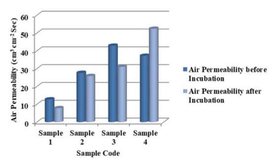 The statistical analysis results of Figure 4 showed that the air permeability after incubation gives the highest values than before incubation, samples exposure to different periods 0- 24 and 48 hours. Therefore it can be exposed for more than those periods till its air permeability after incubation be less than its air permeability before incubation. For air permeability before incubation sample 3 recorded the highest value while sample 1 recorded the lowest value; for air permeability after incubation sample 4 recorded the highest value and in the other side sample 1 recorded the lowest value. Air permeability was affected significantly by both denier per filament and weft density p ˂ 0.001; also it was not affected by incubation p = 0.137, with significant interaction p ˂ 0.001. Also, water permeability was significantly affected by both weft density and denier per filament p ˂ 0.001.