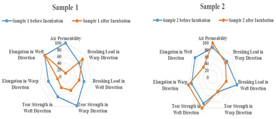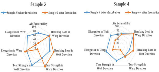 The results of the physical and mechanical properties for samples before and after incubation were evaluated using radar charts in order to plot the best performance of samples in terms of suitable quality for the end use Figures 5 and 6. From radar charts area for samples properties before incubation it was showed that sample 1 recorded the highest area followed by samples 2, 3 and 4 respectively, while for samples properties after incubation sample 2 recorded the highest area followed by samples 3, 4 and 1 Table 4.