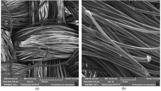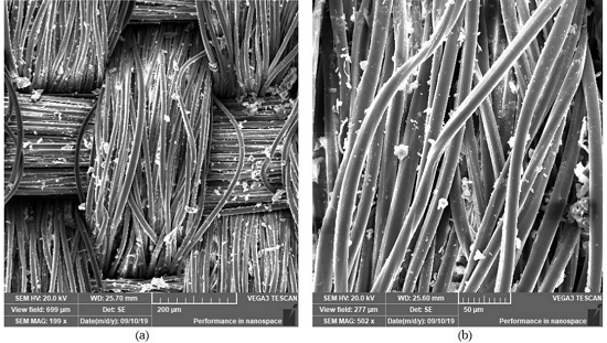 According to the radar chart, SEM was done for sample 2 before and after incubation and it was magnified in 200 and 500X. Figure 7 show numbers of fibers before incubation and after washing. Figure 8 show the gathering of feedstuff particles between fibers and above the surface of the fabric after incubation due to the different incubation conditions (strength; humidity; oven; temperature).