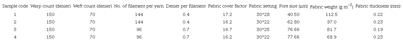 Four sample of polyester microfibers fabrics were manufactured using two filament denier of 0.4 and 0.7 with warp count of 150, denier and weft count of 70, denier, warp density of 30 picks / inch, weft density 22 and 28 picks / inch, and plain 1/1 textile structure as following: