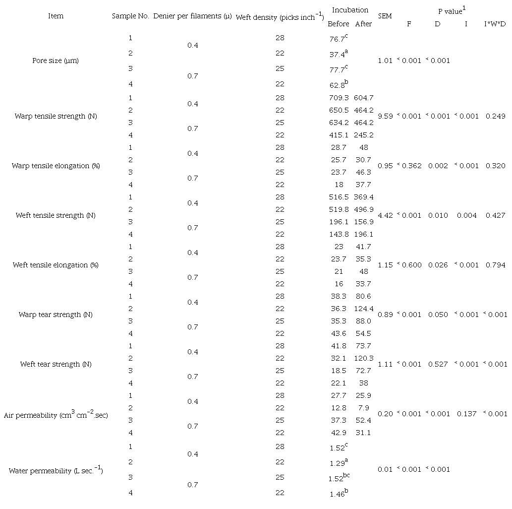 Table 2 represents different physical and mechanical properties of the manufactured in situ bags before and after incubation in the rumen. Bags have a pore size ranging from 40.5 to 77.66, µm and it was significantly affected by both denier per filament and weft density (p ˂ 0.001). Sample 4 recorded the highest pore size, while sample 1 recorded the lowest pore size. Furthermore, fabrics’ pore size was decreased by increasing number of filaments per yarn and vice versa.