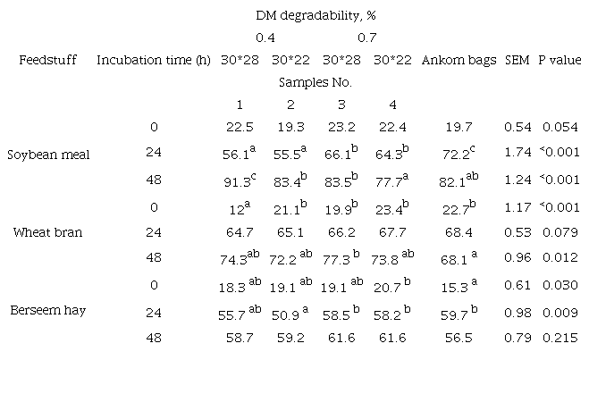 The lower values for ruminal disappearance may be due to the greater efficiency of microfiber fabrics to reduce losing of fine feed particles (Richards, 2005). Also, it seemed that the differences were faded after 48 h of incubation. In contrast, for wheat bran the differences between the observed values of degradability were not significant.