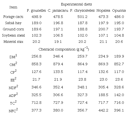 The native cacti were harvested from Caatinga areas and transported weekly to the experiment. The thorns of P. gounellei, C. jamacaru, and P. chrysostele were removed on a daily basis with a butane gas flamethrower and subsequently ground in a forage machine. The introduced cacti (Nopalea and Opuntia) were harvested from cultivated and irrigated areas and after that they were hand-cut with a knife at feeding time. The Sabiá hay was prepared by the gathering of fresh leaves and stalks of tender plants, then ground in a forage machine and spread in 10cm layers in a solar dryer.