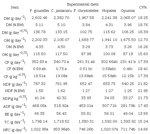 The lowest value observed for the intake of CP by animals fed the Opuntia diet compared with P. gounellei and C. jamacaru diets, which may be explained by the low level of CP (Table 2) in the diet composition with this specie (Opuntia stricta). All diets provided intakes of CP with values above the recommended by the NRC (2007) of 0.211 kg day-1, showing that the experimental diets were able to meet the requirements of CP of the animals.