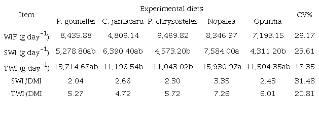 The water intake through food (WIF) did not vary (p > 0.05) between the treatments, with an average value of 7,050.19 g day-1, but there was a difference (p < 0.05) in supplied water intake (SWI) between the experimental diets. There was a difference (p < 0.05) for the total water intake (TWI) varying from 11,043.02 (P. chrysostele) to 15,930.97 g day-1 (Nopalea) (Table 4). The TWI/DM intake and SWI/DM intake ratio were not influenced by the treatments.