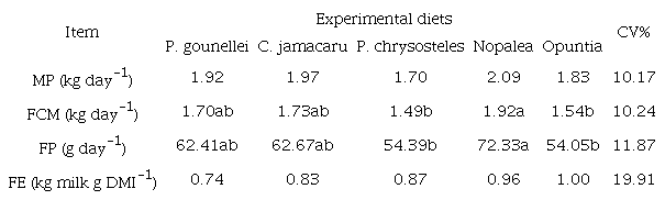 The fat-corrected milk at 4% (FCM) and fat production (FP) differed (p < 0.05) between the types of cacti with higher values observed for animals fed with P. gounellei, C. jamacaru and Nopalea (Table 5). For milk production and feed efficiency (FE), there was no difference (p > 0.05) between diets, with an average value of 1.90 kg day-1 and 0.9 kg milk g DMI-1, respectively (Table 5).
